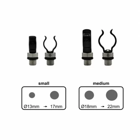 Le repose-canne de sécurité convainc par un design particulièrement mince et élégant. Il tient fermement la canne jusqu’à ce que le pêcheur récupère lui-même la canne. Le modèle plus petit, “Small” est idéal pour n’importe quel blank standard, tandis que la version “Medium” est idéale pour les grips full Duplon et full liège. Pour un maintien optimal, il est important que le support de canne de sécurité soit perpendiculaire à la canne. Les bras flex-grip sont en acier à ressort caoutchouté et s’adaptent donc parfaitement à la canne.